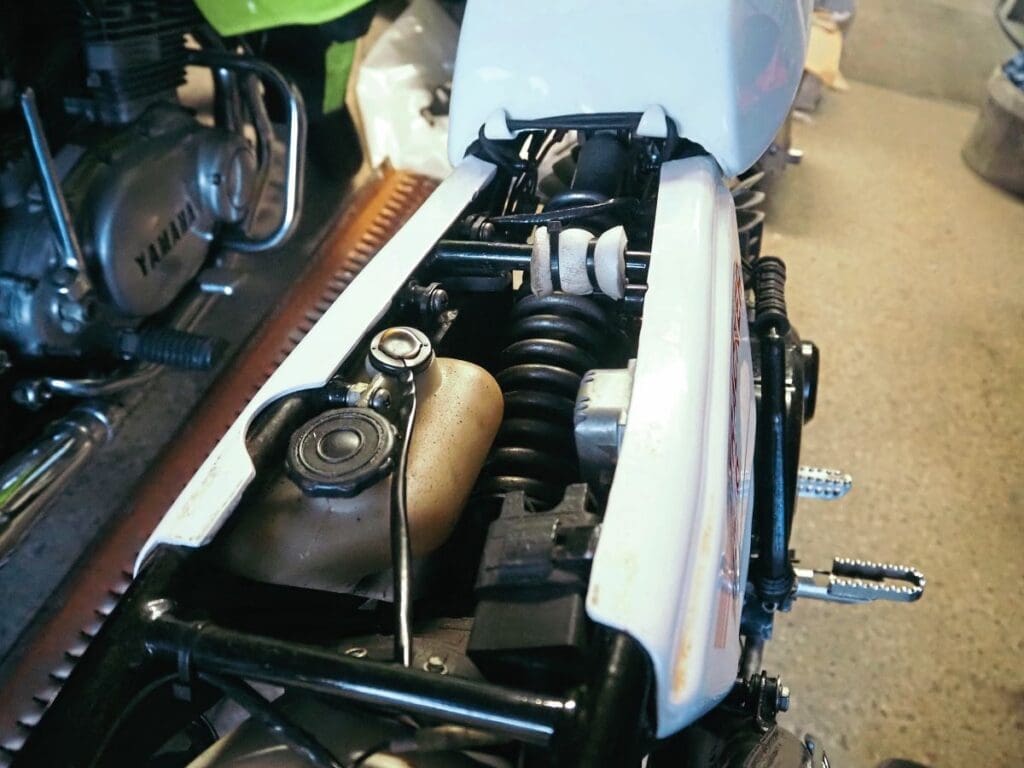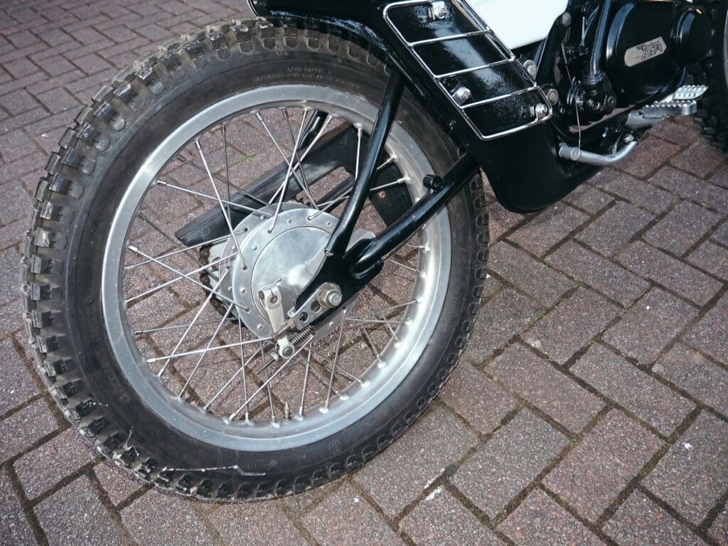 It had a rubber 25/25 watt, a pretty feeble 6v CEV headlamp, and the ignition on the 125 was flywheel magneto, while the 175 used CDI. There was a 4amp/hour 6v battery which seems to be there to power the indicators. The Yamaha oil tank was tucked away neatly under the seat. With British motorcycle design long plagued by vibration worries, a lot of effort was put into the use of rubber anti-vibration mounting points. The seat was wide but rather too short for the comfortable transportation of two people and mounting the pillion rests on the bottom run of the swingarm meant that any passenger needed very flexible knee joints, but this was a feature of many trail bikes of the day.