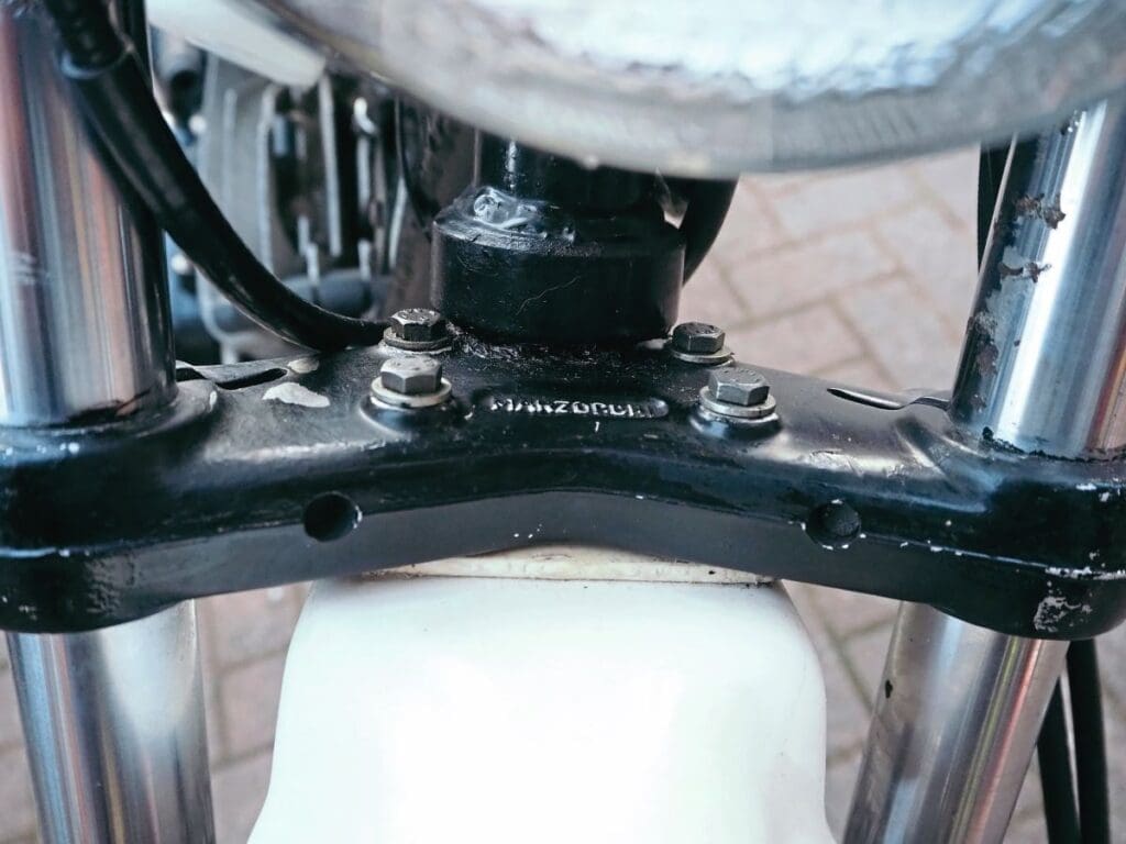The exhaust was designed by NVT, then made by Lafranconi and also finished in the UK. It was given a look similar to that on the old BSA 250 and 500 unit singles. This did cause some issues as Yamaha’s original exhaust curved tightly at the bottom of the barrel, swooping upwards and tucking itself under the seat. Putting the pipe along the bottom of the engine affected two things: the kick-start had to be awkwardly kinked to clear the pipe; and on the 175, Yamaha had big cut-outs on the cylinder head to accommodate the high pipe which were not needed with the low pipe and made the Rambler’s engine look unbalanced. The Yamaha badging was machined off the engine casings and replaced by an NVT sticker.