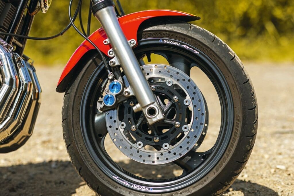 Elsewhere, the header pipes were no longer linked via the notoriously leak-prone coupler system; Suzuki chose to sacrifice a little torque for more power. Finally, Suzuki had dropped the notoriously bad plastic gauge lenses and used glass like everyone else, allowing owners to actually see speed and revs instead of peering through cloudy plastic. Sitting here under a blistering sun there’s swathes of resplendent chrome exquisitely counterpointed by Suzuki’s Rose Red paintwork.