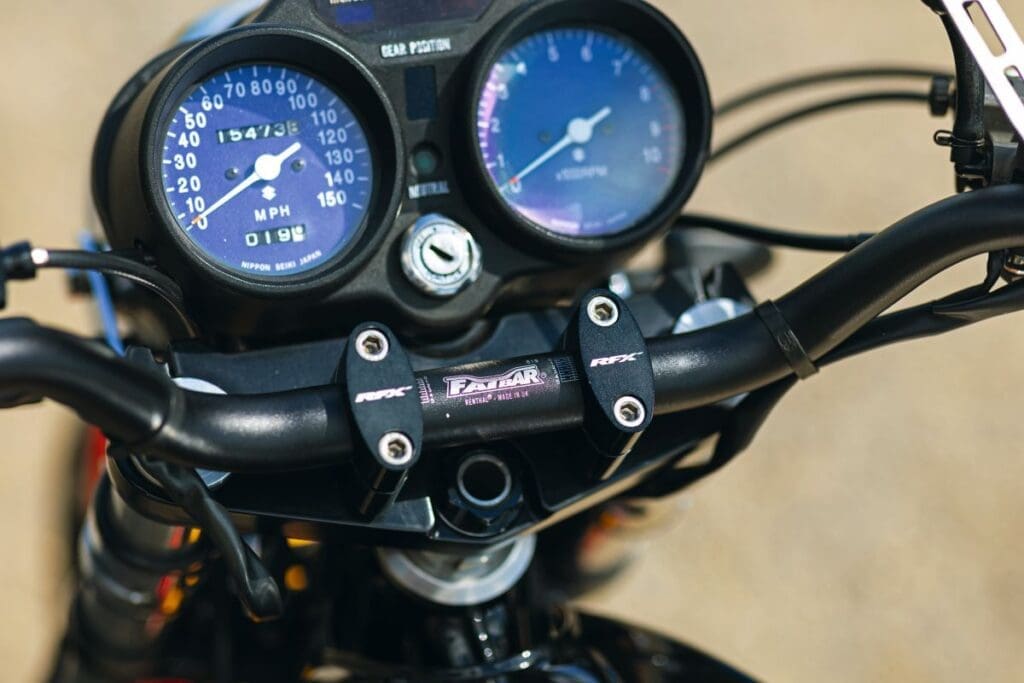 From an aesthetic perspective there’s sufficient GT550 still there in the form of the tank, side-panels, air-box, headlight, and instrument binnacle to readily identify the bike.