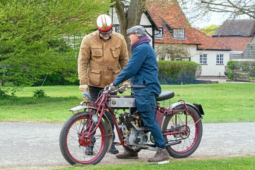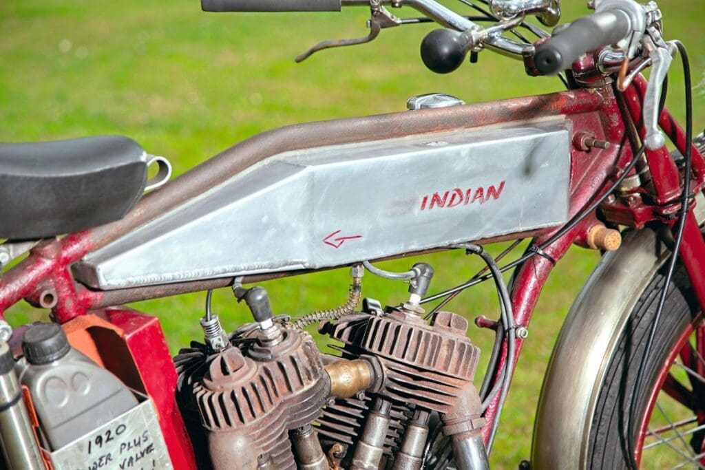 A sprung Wassell trials saddle provides rider comfort, while an aluminium petrol tank made by Stuart Digby Developments takes care of fuelling, sitting between the top two frame tubes as per the original early Indian machines. Overall, it retains the essence of the Indian brand and although it might not look the prettiest bike, it certainly goes well and is still very much a 1920s Indian.
