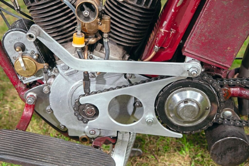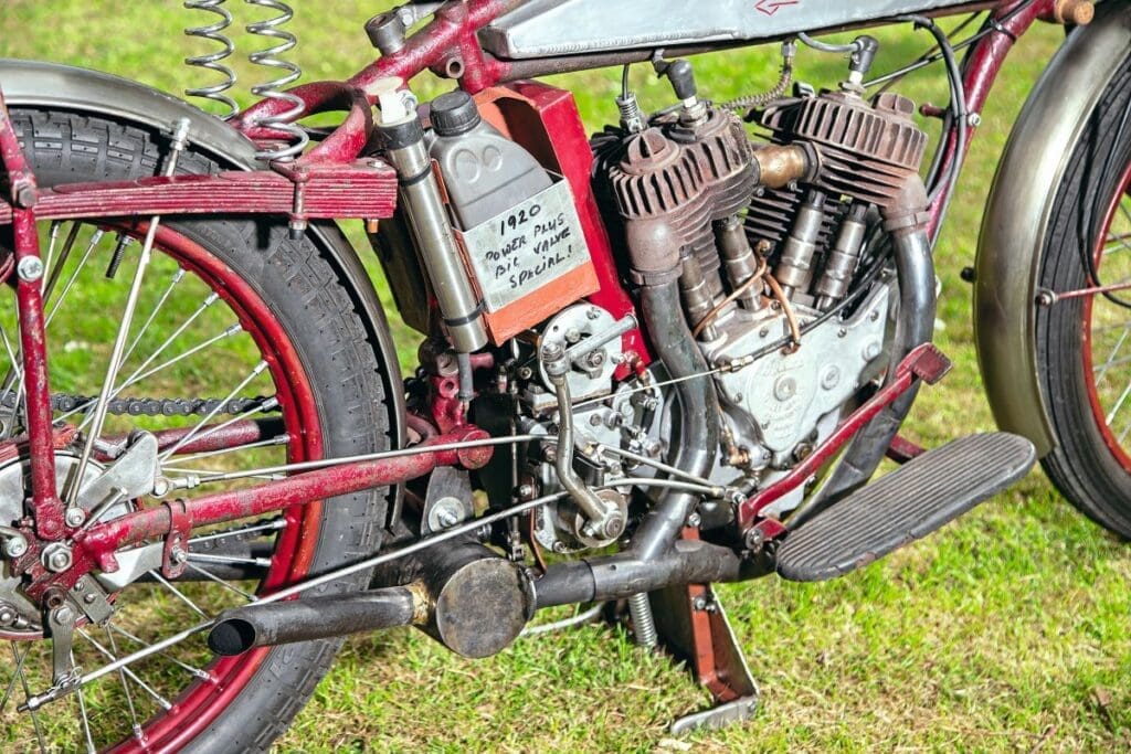 Originally it would have had a 60.88 cubic inch side-valve twin pumping out 18bhp, but maintaining the 42-degree V-twin angle to enable Indian to keep using the same magnetos and other parts. The Powerplus used a slightly smaller bore coupled with a longer stroke than the earlier F-head motor, but used the same single two-lobed camshaft to operate all four valves, and carburation was though a single Schebler unit. Apparently, the main motivation for the new motor and machine was it was cheaper to make, but it sold mainly on the increase in power, rather than price.