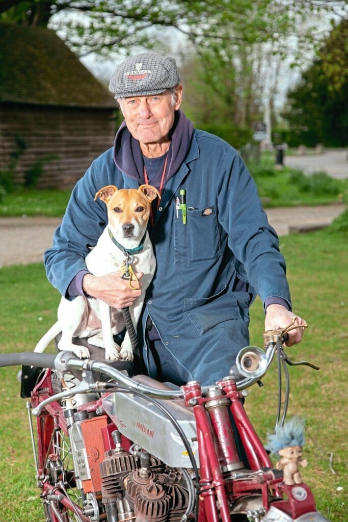 Graham Tindell has appeared in these pages before with his somewhat fearsome Indian grasstrack racing machine, on which he had considerable success in VMCC events. The grasstracker was built by Graham’s late father Alf, who, as Graham explained, obtained a whole lot of dismantled Indian machines in the early 1970s, and after restoring an original veteran from them which he used in the Pioneer run for many years, he had a lot of leftover parts. Some of them found their way into the grasstrack machine and some of the others you see here on a bike which Graham himself built, when he inherited the parts.