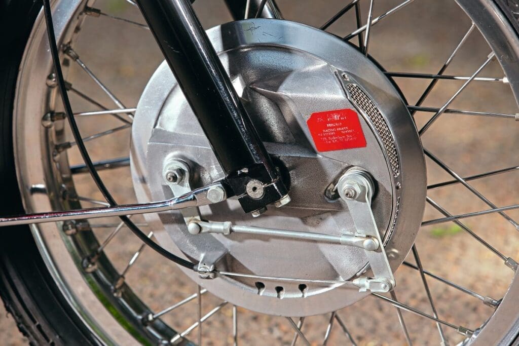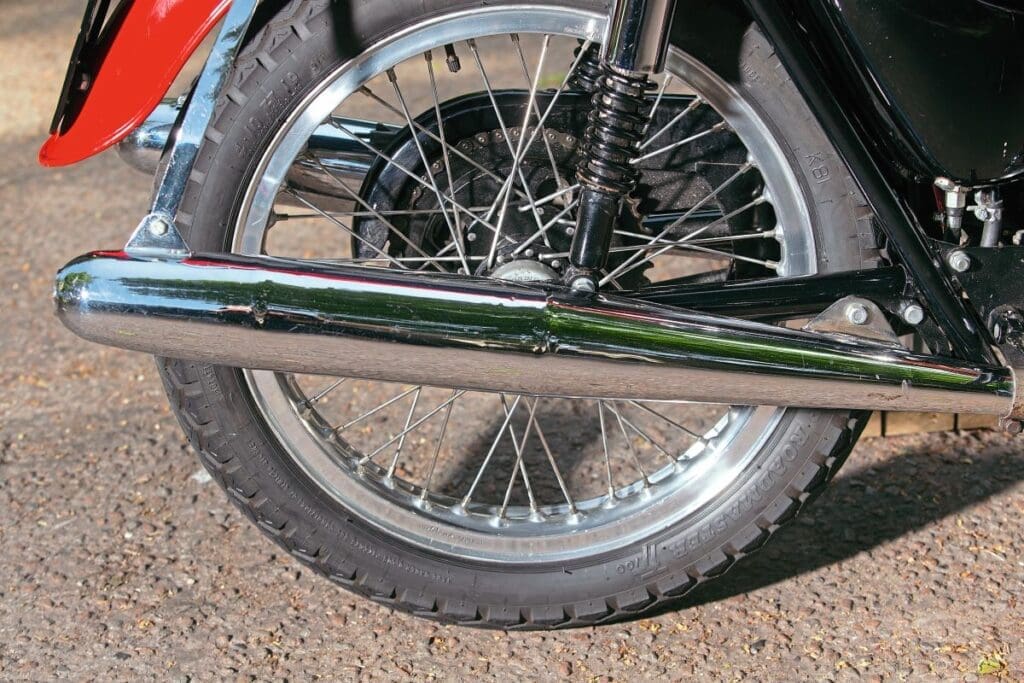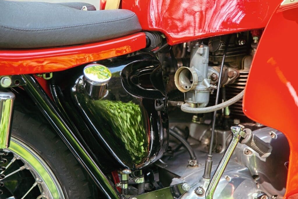 The now distinctive free-flowing cigar-shaped exhausts held in place by flat metal straps helped up the power to 54bhp, over a standard bike’s 47bhp. Although that figure was quoted on a standard gearbox, rumours suggest a few were fitted with close ratio boxes.