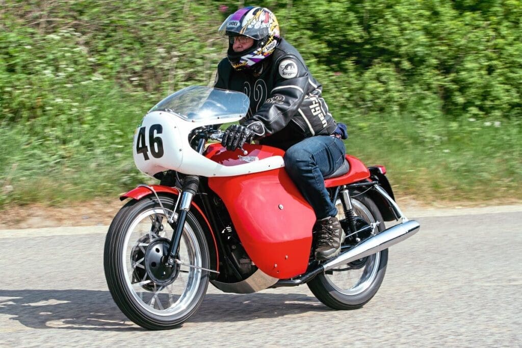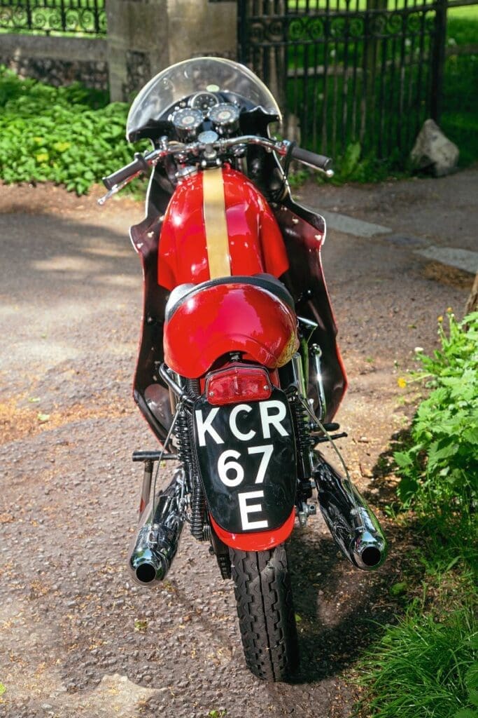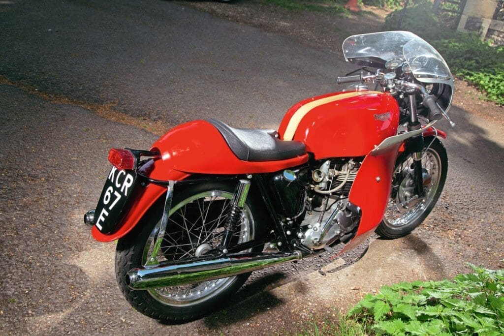 To meet regulations, the handlebars had to be clamped to a standard top yoke, but ‘Thruxton Bend’ bars were used to get something of a racing crouch more suitable for competition, along with a single seat with a rest at the rear.