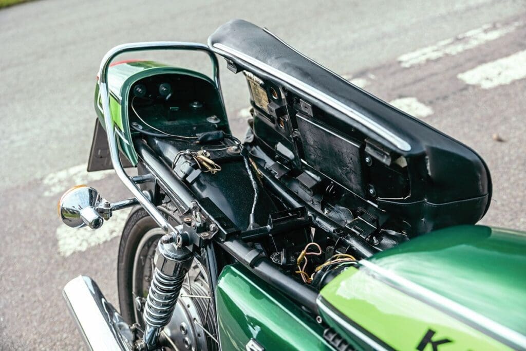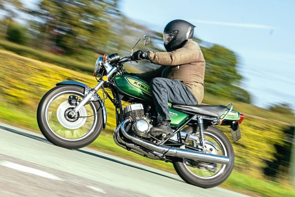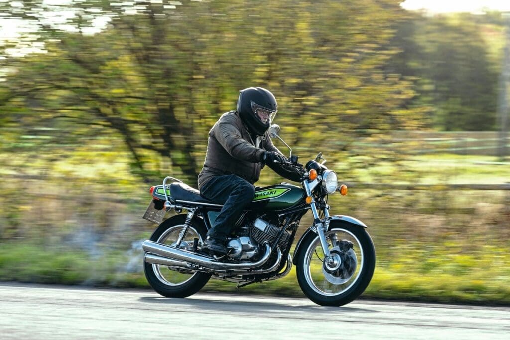 Classic Motorcycles Ltd of Cheshire had a late-model H1 in stock from 1976 for a reasonable £8999 and kindly let me have a ride on the allegedly unrideable monster. Now, by ’76, the H1 was toned down a little and substantial changes had been made to the frame and braking. It looked fab in Kawasaki Green and it had a stance to die for.
