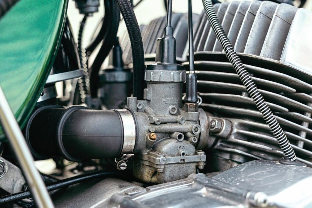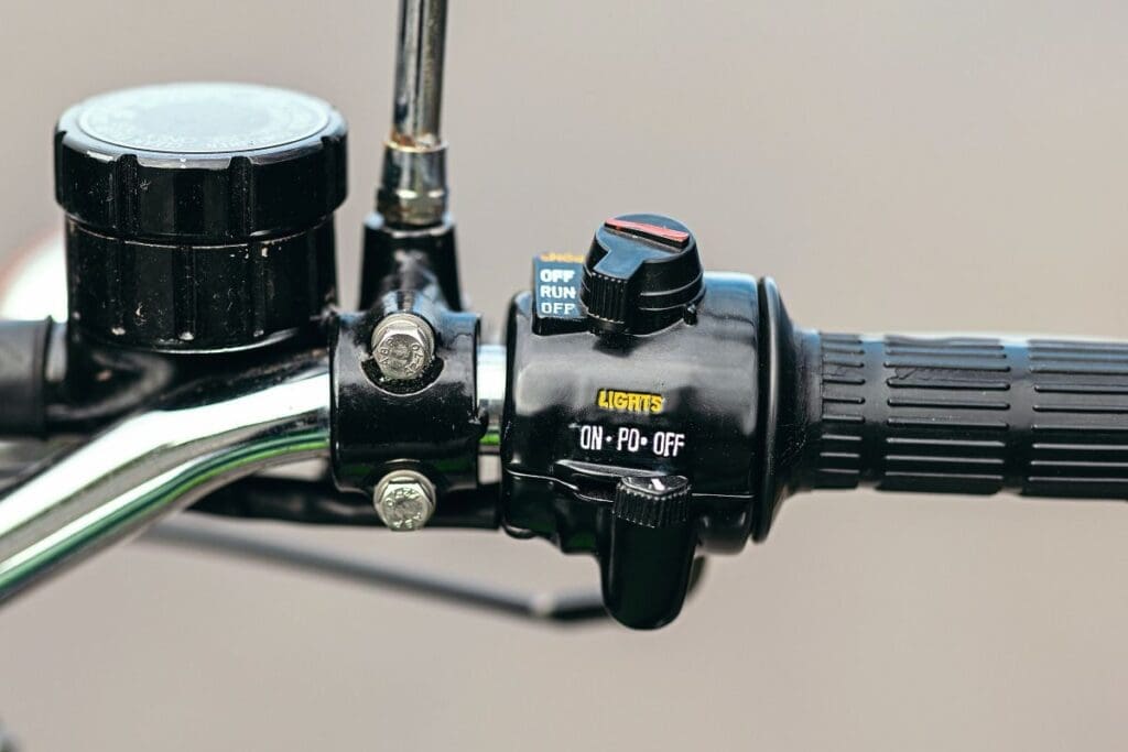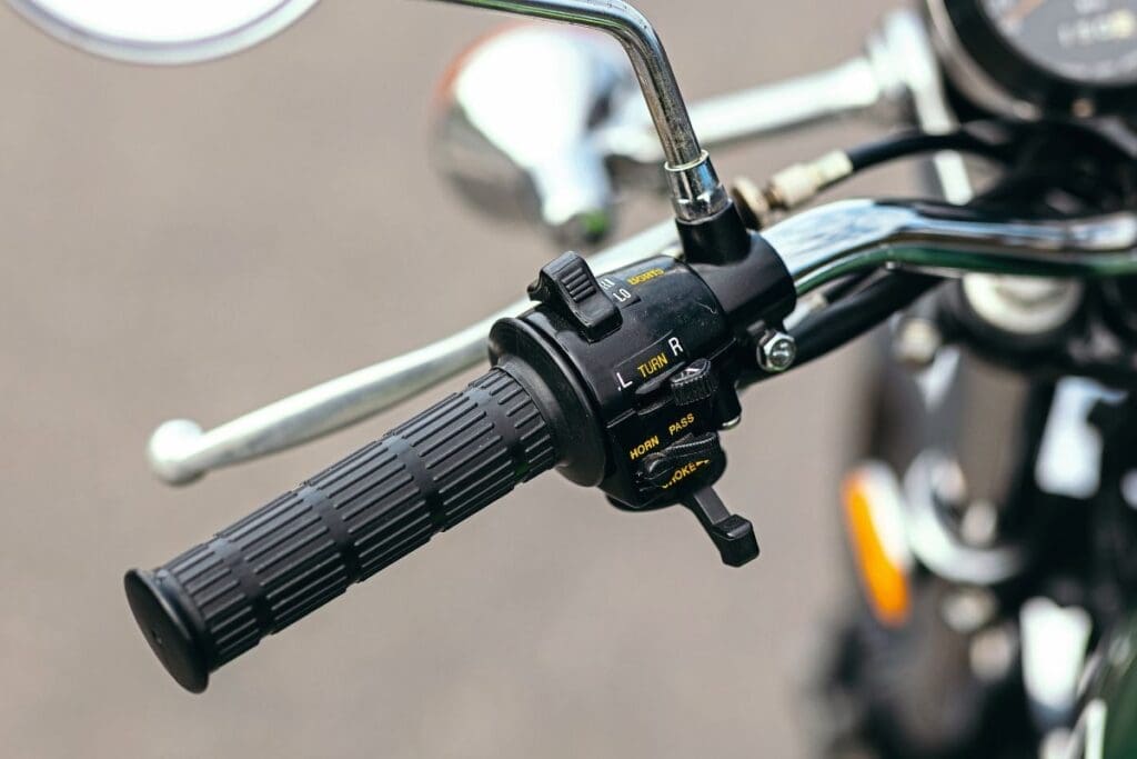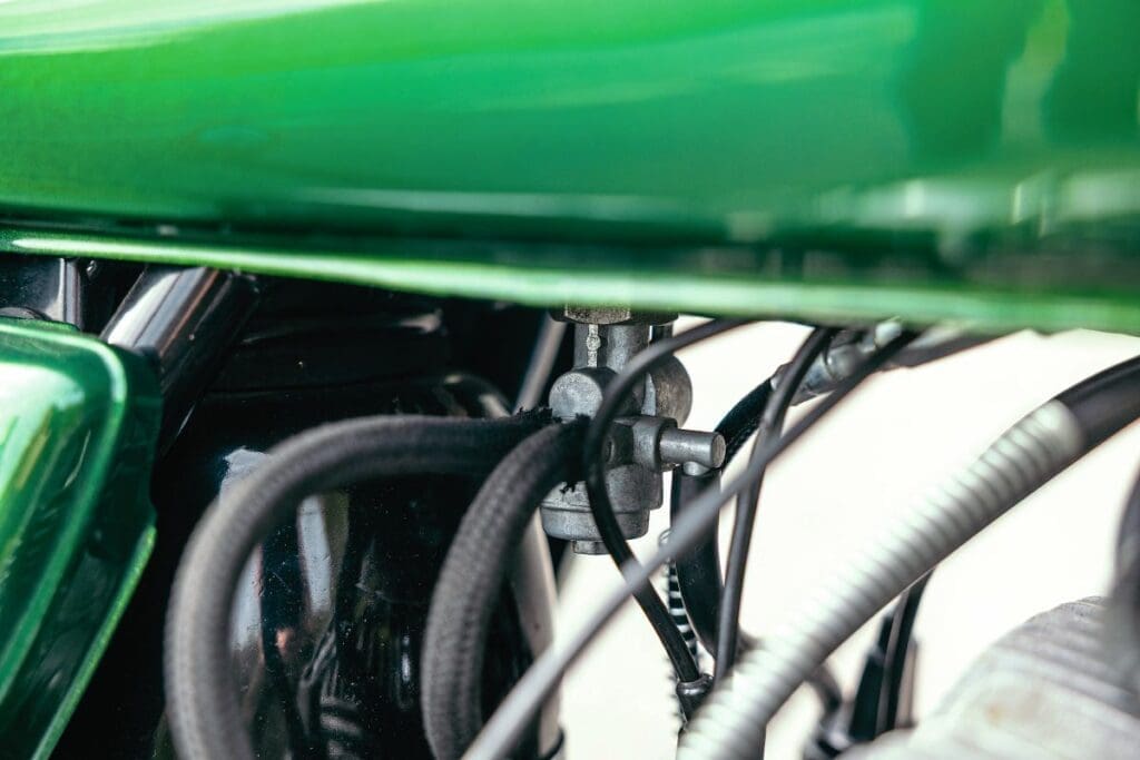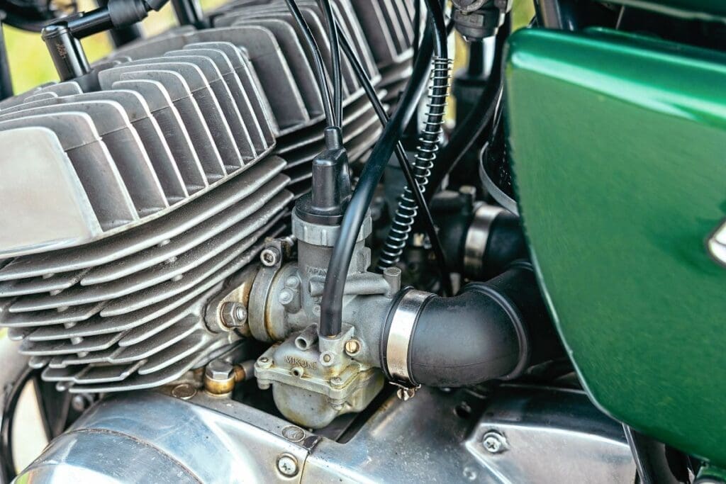 There were three carburettors, operated by individual cables running to a splitter that was controlled by a single throttle cable. A second cable on the twist crip controlled the ‘Injectolube’ two-stroke oiling system.