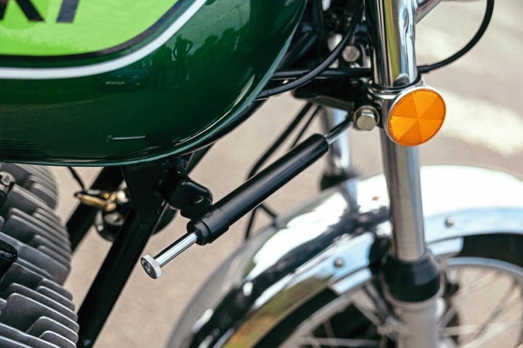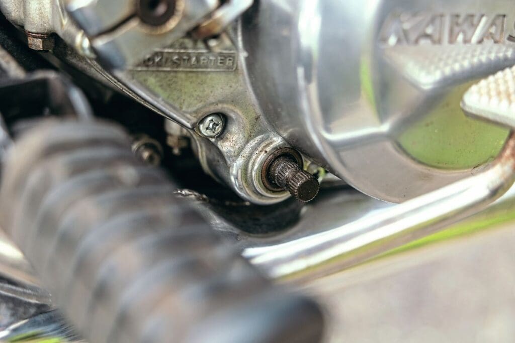1969 H1 Mach III: The fixed capacitor discharge ignition was ground-breaking, if primitive, and there was the twin leading shoe front drum brake. The gearbox was five-up, with neutral at the bottom, and you could swap round the gearshift from right to left should you desire it if you were used to British or Italian shift patterns. The tank featured deep knee scallops and there were Mach III badges. Few 1969 models came to the UK as Kawasaki did not have an official importer at the time, but plenty have since, as grey imports.