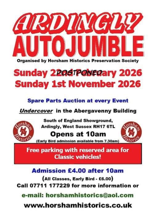 Due to flooding on site Horsham Historics has had to change the date of its autojumble to February 22, 2026 to March 8, 2026. Please share this far and wide.